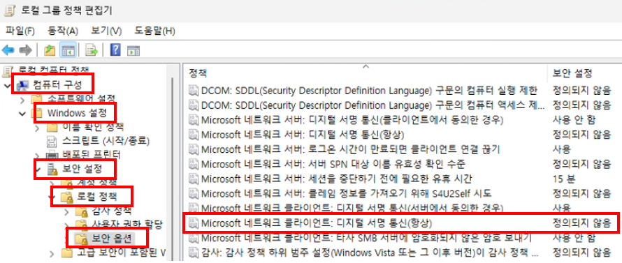 'Microsoft 네트워크 클라이언트: 디지털 서명 통신(항상)' 부분을 보자.